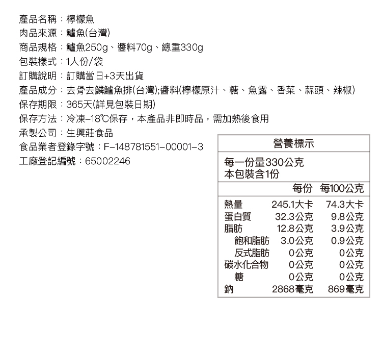 商品規格:鱸魚250g、醬料70g、總重330g。